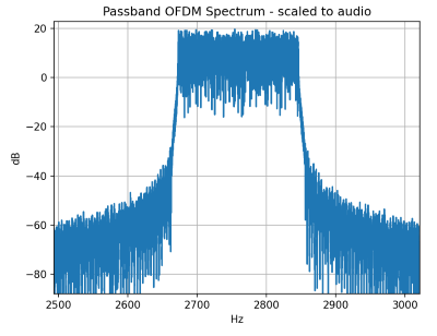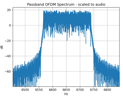 For example, the figure below shows the spectrum of a 1.6 ms long WiFi packet (PPDU) as a 160 MHz OFDM waveform centered on Channel 164 in the upper 5 GHz band (carrier = 5.815 GHz). When scaled to audio using wavelength-equivalent mapping, the carrier would be at 6.65 kHz with a corresponding 182 Hz of bandwidth.