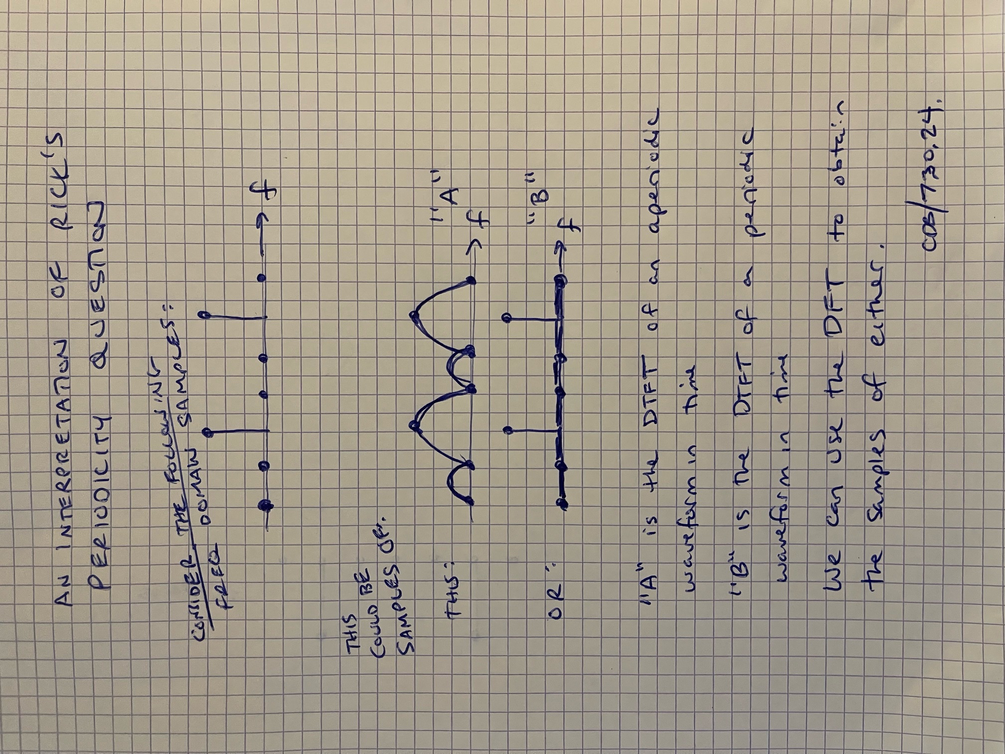 (1) Samples of the Discrete Time Fourier Transform (DTFT) of a related periodic sequence, with the time domain samples given as the inverse DFT and periodically extending to $\pm \infty$.