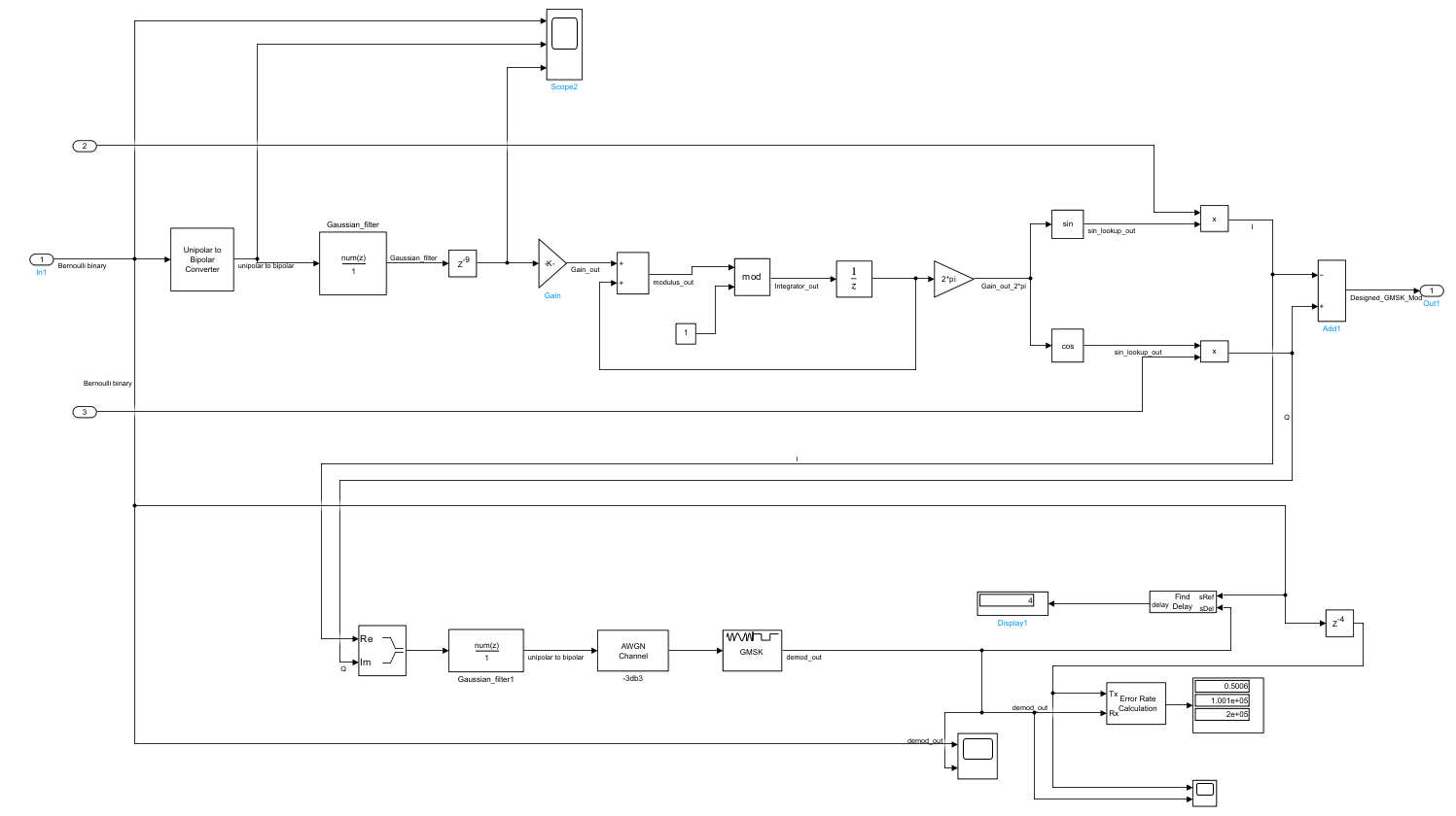 I have implemented gmsk modulator with reference to your response and also tried with the implementation of gmsk demodulator. In demodulator, since the phase of the modulated signal needs to be extracted since the information is encoded in phase changes between symbols, I made use of a differential discriminator for that purpose using the multipliers and delay units. And then used a switch to provide a threshold level to get the output in binary. The below shown is the rough draft of the blocks. But however, I'm not getting a good value during error rate calculation. If possible, could you provide an insight on where I went wrong.